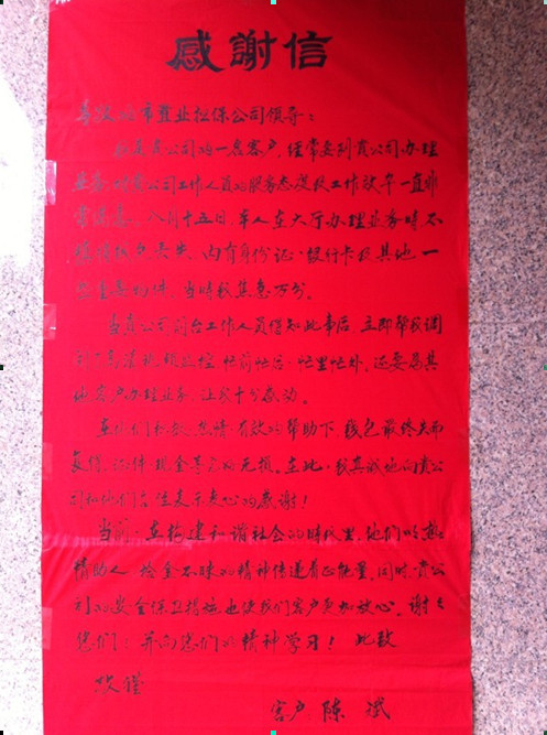 工作人員的熱情細(xì)致的服務(wù)態(tài)度,給陳斌先生及家人留下深刻印象。事后,為了表達(dá)感激之情,陳先生送來親筆抒寫的感謝信,寫道:“在構(gòu)建和諧社會的時代里,他們以熱情助人,拾金不昧的精神傳遞著正能量!同時,安慶市房屋置業(yè)擔(dān)保公司的安全保衛(wèi)措施也使我們客戶更加放心!”